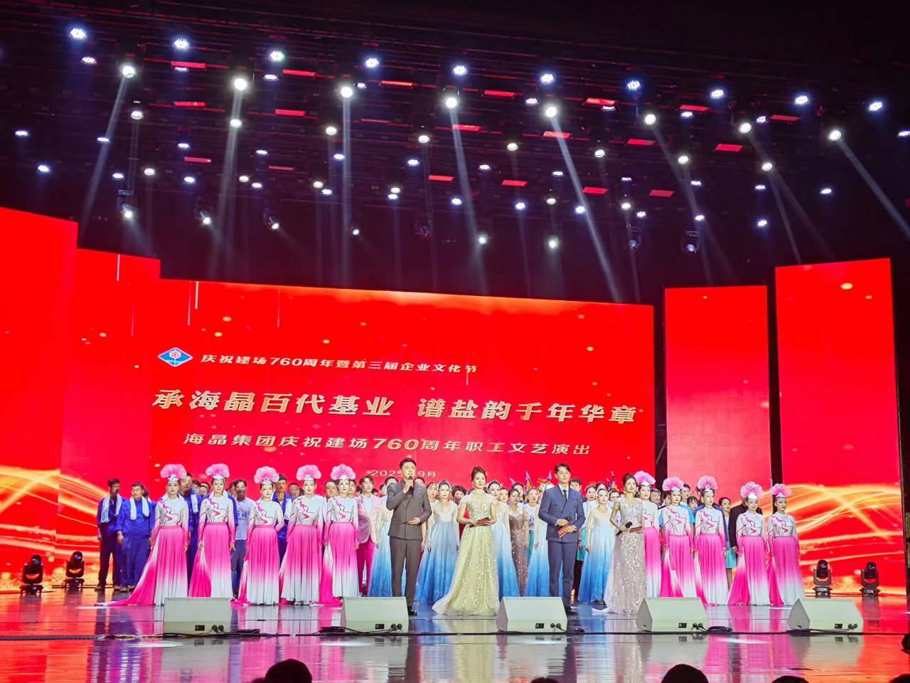 一年秋意浓,十里盐花香。9月24日,公司在塘沽大剧院举办了“承海晶百代基业 谱盐韵千年华章”庆祝建场760周年暨第三届企业文化节职工文艺演出活动。本次演出共分为“溯寻荣光”“创业辉煌”“传承逐梦”三个篇章,以舞蹈、歌曲、朗诵、情景剧、快板等多种艺术形式,生动展现了海晶人锐意进取、奋发有为的精神风貌。